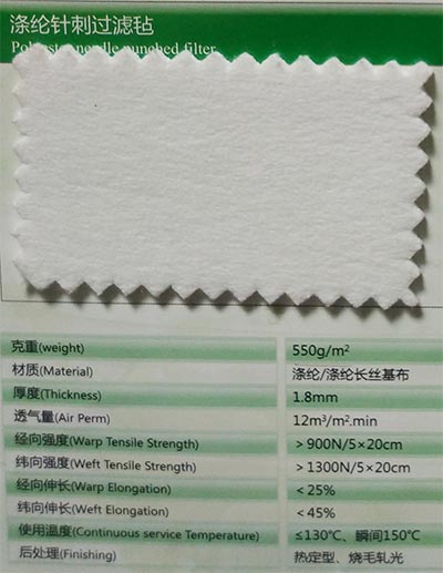 該品種采用滌綸纖維在滌綸基布上針刺而成,并采用燒毛壓光、定型等后整理工藝,濾料具有空隙率高、耐磨、耐折、透氣性好等優(yōu)點(diǎn),是目前被廣泛使用的一種常溫過(guò)濾材料。